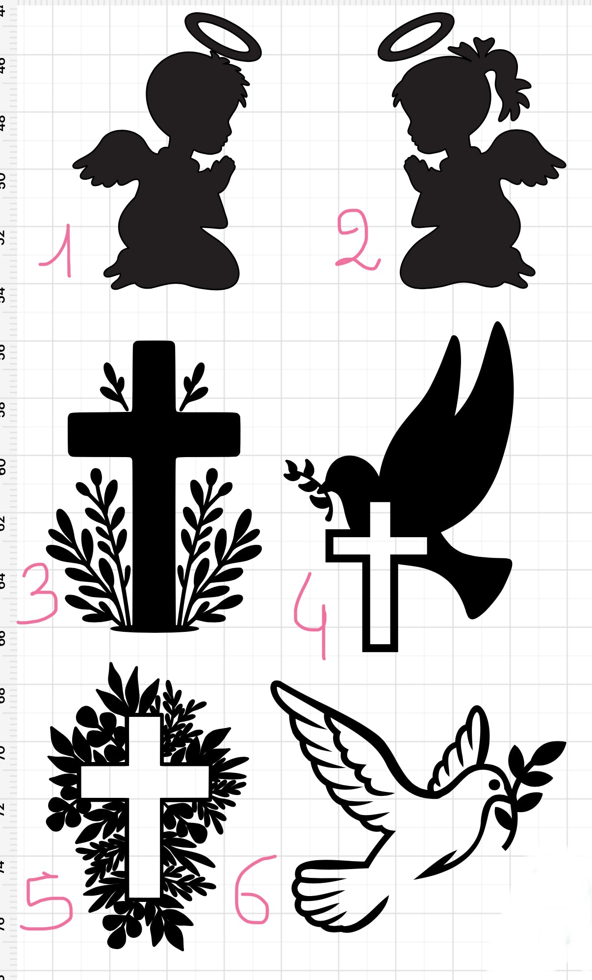 - Personnalisation : prénom, date et motif (colombe, croix, branche d’olivier…)