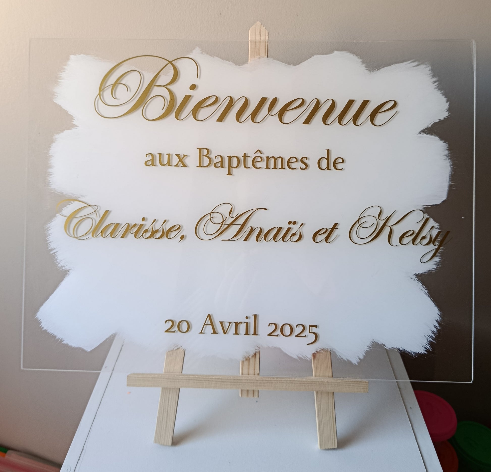 Accueillez vos invités avec élégance grâce à ce panneau de bienvenue personnalisé pour tous vos événements. Son design épuré, avec un fond peint à la main, apporte une touche moderne et chaleureuse à votre décoration.